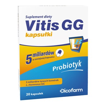 Vitis GG Nowa Formuła - suplement diety zawierający 5 miliardów żywych komórek bakterii w jednej kapsułce. Produkt przeznaczony dla osób dorosłych.
