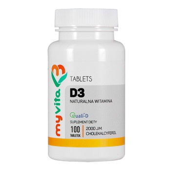 MyVita Witamina D3 - suplement diety w postaci tabletek zawierający w swoim składzie cholekalcyferol z lanoliny. Produkt przeznaczony dla osób dorosłych.