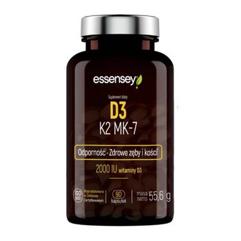 Essensey Witamina D3 K2 MK-7 - to suplement diety w postaci kapsułek, który zawiera witaminę D i K. Produkt przeznaczony dla dorosłych.