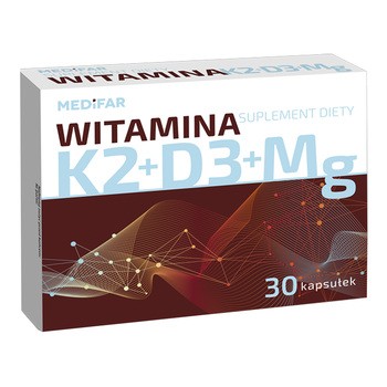 MEDiFAR Witamina K2+D3+Mg - to suplement diety w formie kapsułek, który w swoim składzie zawiera witaminę K2, magnez oraz witaminę D. Produkt przeznaczony dla dorosłych.