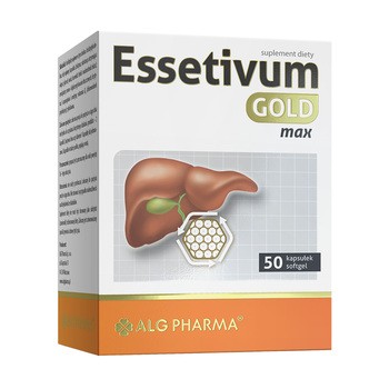 Alg Pharma Essetivum Gold Max - to suplement diety w formie kapsułek, który w swoim składzie zawiera fosfolipidy sojowe, L-asparaginian L-ornityny, ryboflawiną i witaminę B6. Produkt przeznaczony dla osób powyżej 16. roku życia.